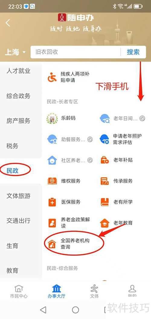 3、 下滑手机,进入民政页面,选择全国养老机构查询功能。