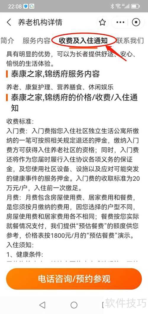 5、 点击收费及入住通知可了解该养老机构的收费标准与入住要求。
