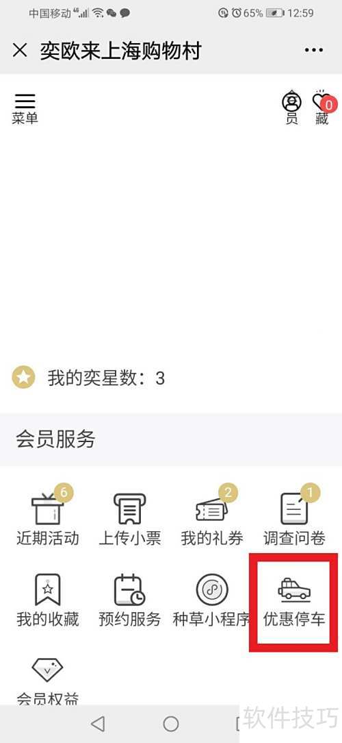 6、 进入会员页面,点击优惠停车,详见红色框标注处。