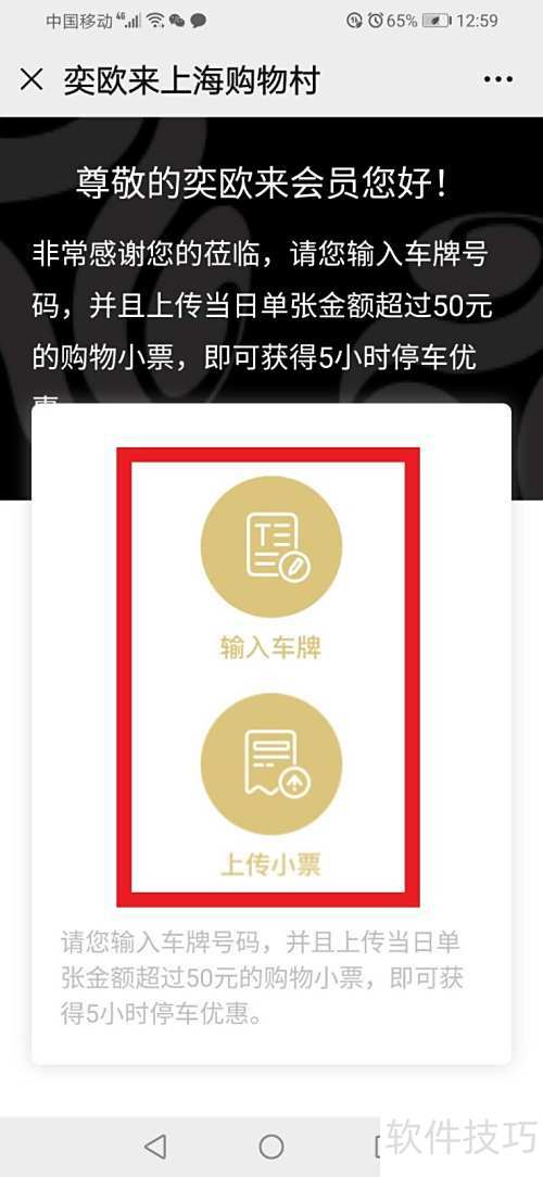 7、 输入车牌并上传单笔满50元的购物小票,即可获赠5小时免费停车,操作完成,详见图中红框部分。