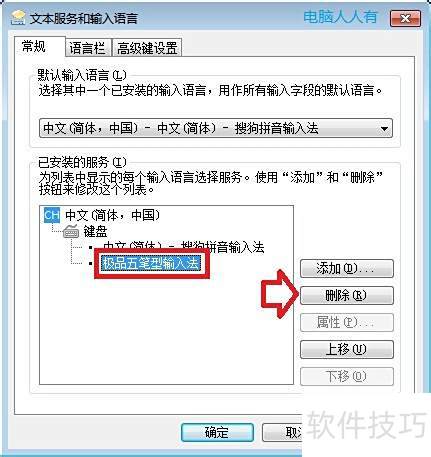 3、 进入文本服务与输入语言,选择常规,删除极品五笔新输入法后确认。