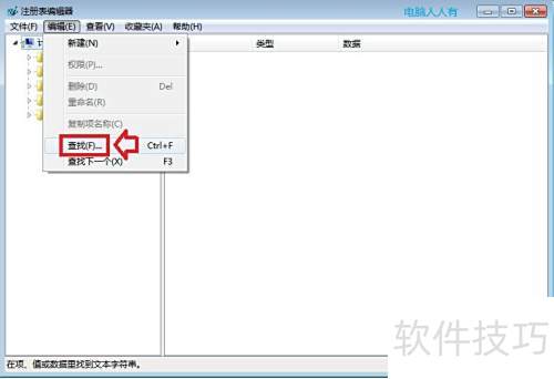6、 打开后请先点击计算机,因注册表会记忆上次位置,随后依次选择编辑和查找功能。