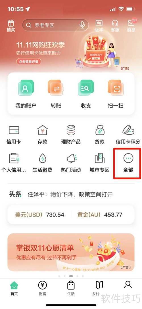 1、 打开中国农业银行APP,进入后点击全部选项。