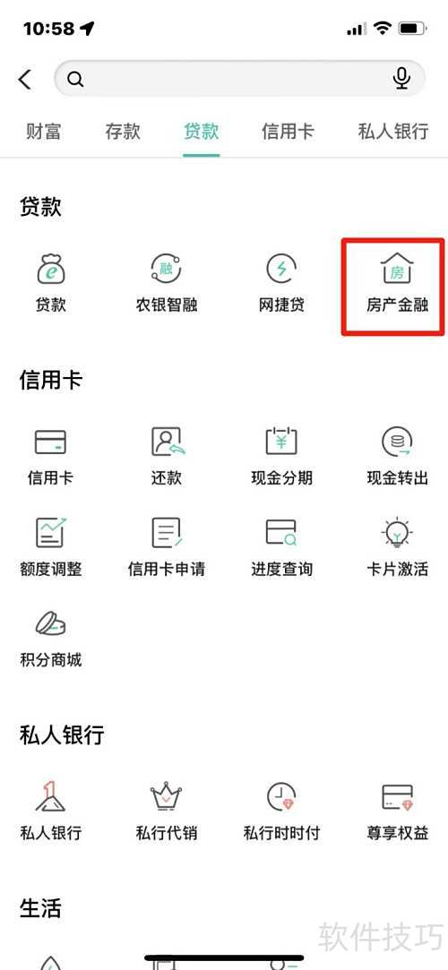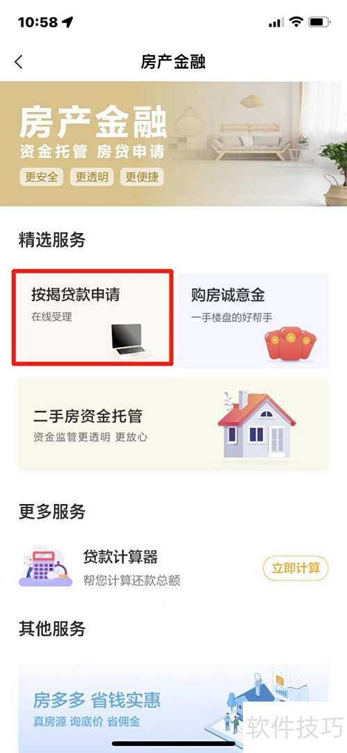 3、 进入房产金融页面,选择并点击按揭贷款申请选项。