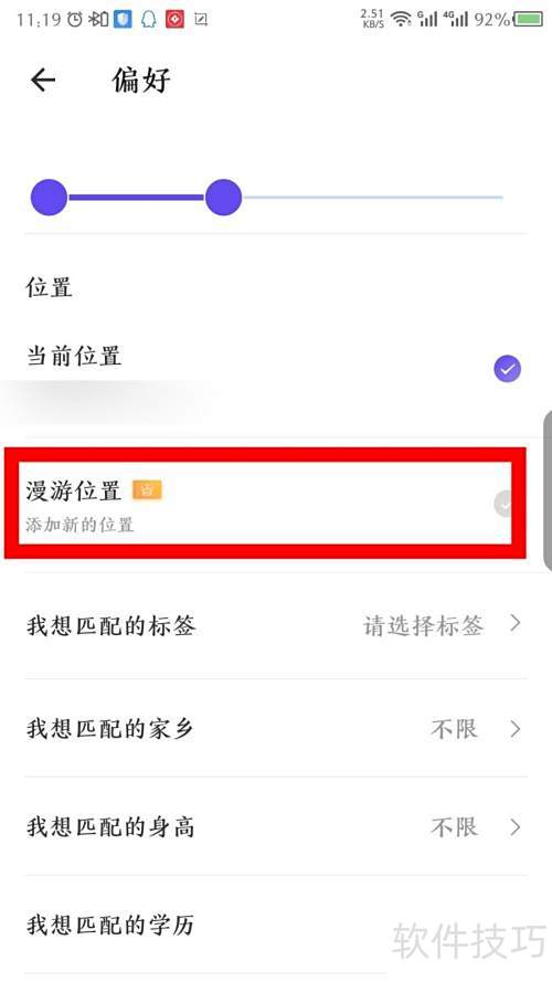4、 打开后可查看当前位置,下方支持添加漫游地点,点击相应选项即可操作,所示。