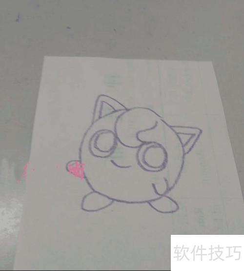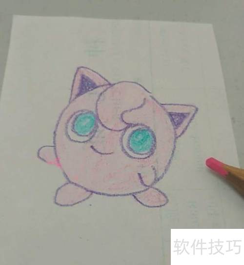 8、 最后进行上色,眼睛用浅蓝色,耳朵内三角用紫色,其余身体部分涂成粉色,一只小精灵便完成了。