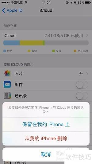 5、 进入设置,点击iCloud,关闭通讯录同步,并在提示时选择保留在我的iPhone以保留本地数据。