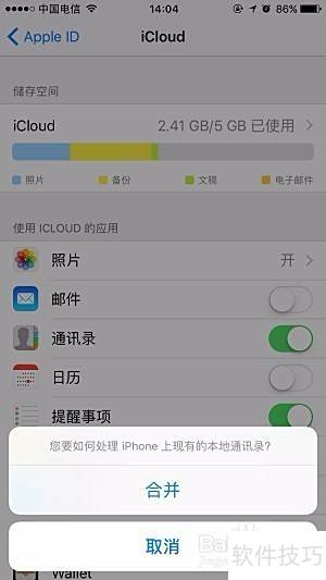 6、 滑动开启按钮后,系统将提示处理现有本地通讯录,选择即可。此后,手机会通过iCloud的备份功能逐步恢复所需的联系人信息,确保数据完整同步。