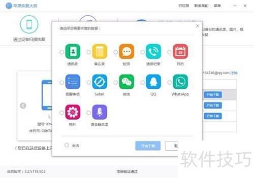 9、 下载安装通讯录恢复工具,启动后选择通过设备扫描恢复模式,点击下一步。进入功能界面后,找到并点击通讯录图标,开始恢复相关数据,操作所示。