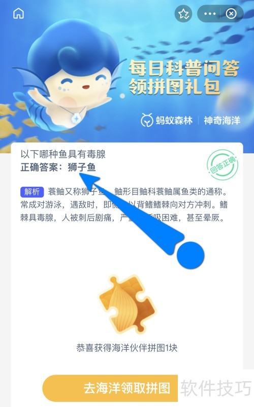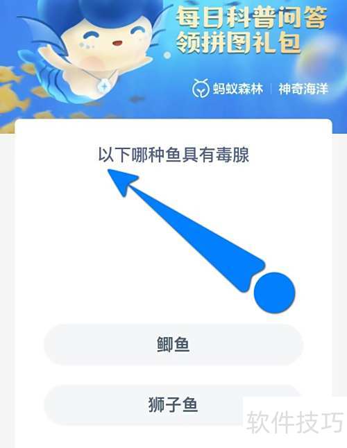 1、 进入支付宝神奇海洋,题目为:以下哪种鱼拥有毒腺?