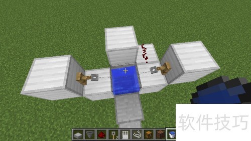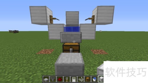 2、 在箱子上放置半砖,左侧半砖为挂机位置,铁门后置音符盒,其上再放一方块。
