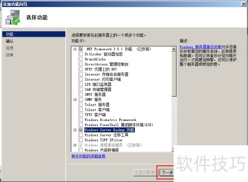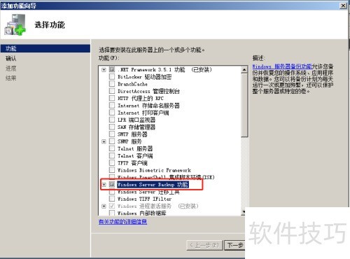 6、 打开所示界面,选择并勾选Windows Server Backup功能即可。