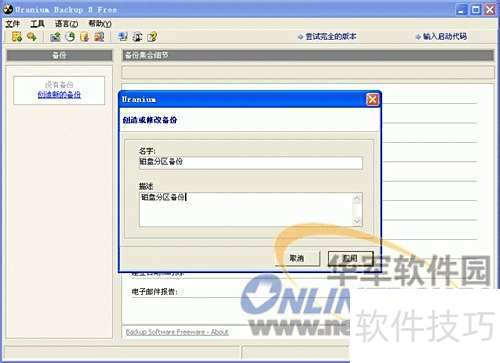 2、 安装Uranium Backup后,界面将自动由英文切换为中文。用户可点击软件左侧的创建新的备份按钮开始系统备份。点击后,系统会弹出新建备份窗口,此时需输入备份名称及详细描述信息,以便后续识别和管理备份任务。