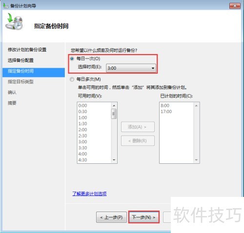 7、 在此界面设置备份频率,因是完整备份,耗时较长,建议每日一次。选择每天,并设定时间为凌晨3点,确认后点击下一步即可。
