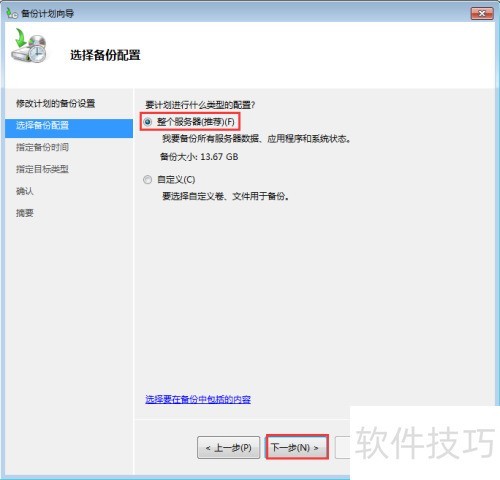 6、 在弹出窗口中点击下一步,选择备份范围,可全选服务器或按需选择。此处以完整备份为例,勾选整个服务器后,继续点击下一步即可。