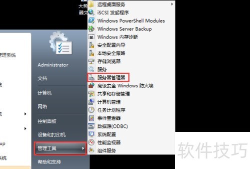 1、 在电脑桌面依次打开开始菜单,进入管理工具中的服务器管理器。