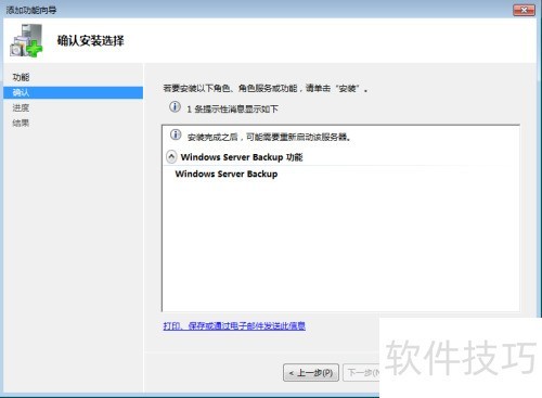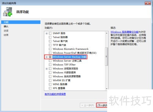 3、 在功能添加向导中选择并勾选Windows Server Backup,随后点击下一步继续操作。