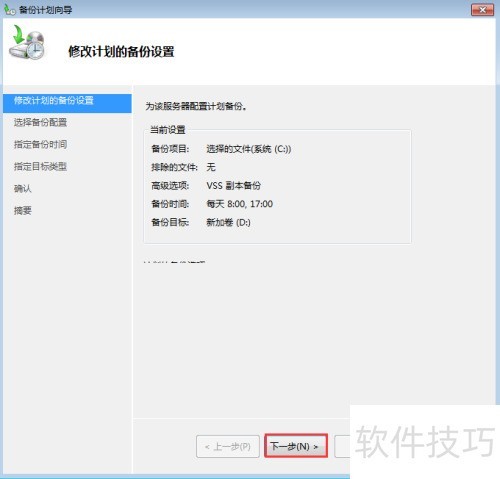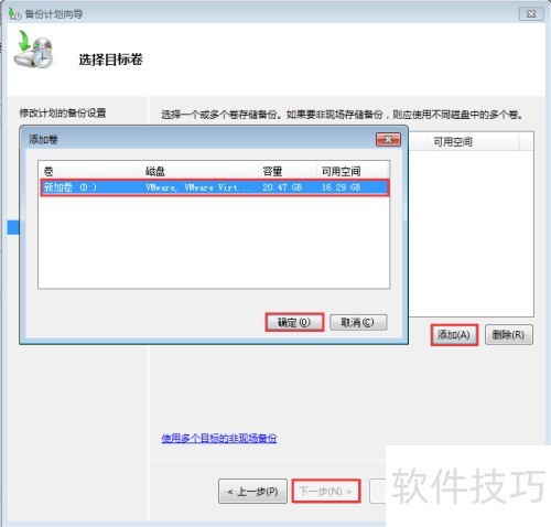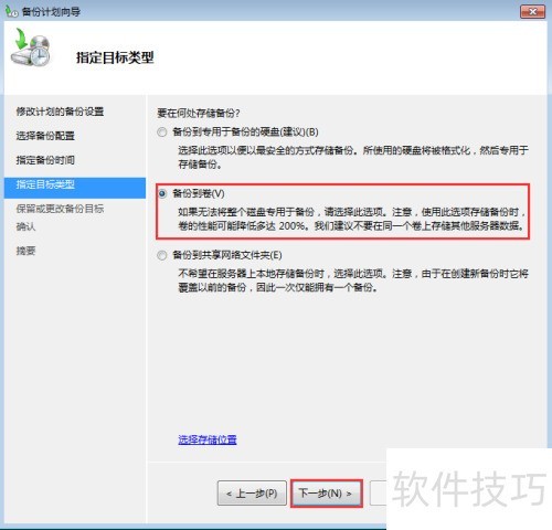 8、 在此界面需选择备份文件的存储位置,提供三种方案。其一是配置专用备份硬盘,读写高效且数据安全,但此硬盘将专用于备份,无法存放其他资料。其二是将备份文件与普通数据共存于同一磁盘,虽提高了磁盘空间利用率,但安全系数相对较低。其三是将备份文件存入网络共享磁盘,安全性较高,但传输速度较慢。综合考虑后,选择第二种方式,即将备份文件保存至指定卷,随后点击下一步继续操作。