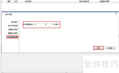 16、 在左侧选择备份数据清理,右侧设定清理周期,完成后点击右下角保存按钮即可生效。