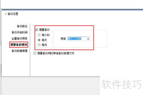 15、 在左侧选择增量备份频率,右侧启用增量备份功能,并设定具体周期。相比全量备份,增量备份耗时和资源更少,可适当提高执行频率。