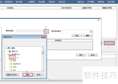 12、 在源备份路径后选择目标路径,点击浏览按钮,在弹出窗口中指定备份文件的保存位置,确认后点击确定,再点击添加。若需备份其他文件,重复上述步骤即可完成操作。