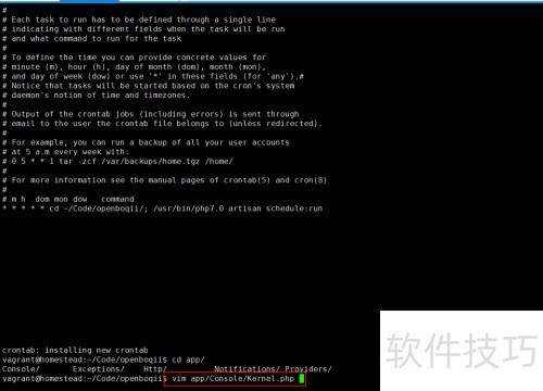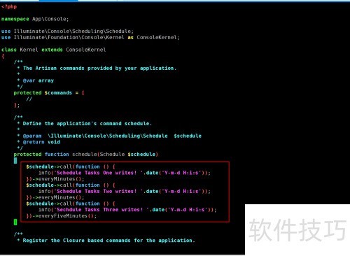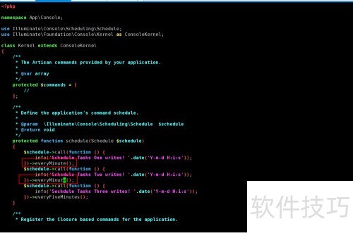7、 接着修改 Laravel 项目中 app/Console/Kernel.php 文件,进入 schedule 方法,添加一个基础的定时执行任务,用于实现计划任务功能。