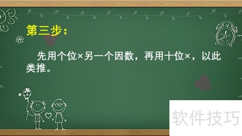 6、 先用个位数乘另一个因数,再用十位数乘,依此类推。