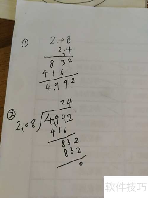 3、 通过竖式除法,将4.992分别除以2.08或2.4,即可得出结果。
