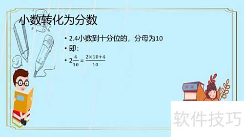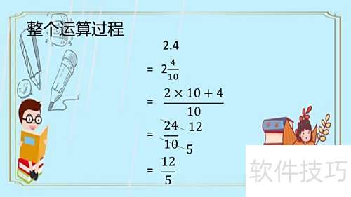 将2.4化为分数,可看作24个十分之一,即分母为10,分子为24,约分后得12/5。小数位决定分母,一位小数对应十分之几。