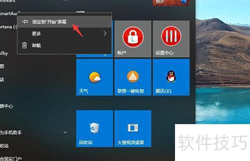 3、 右键点击smart audio,从菜单中选择固定到开始屏幕。