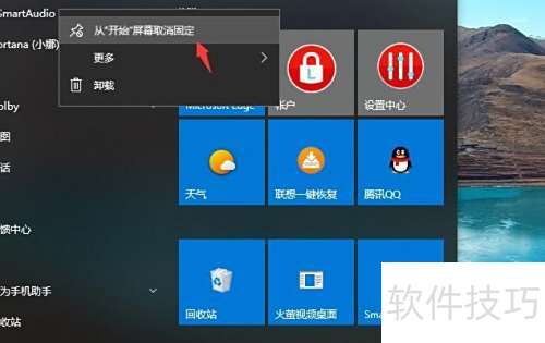5、 右键点击smart audio,选择取消固定到开始屏幕即可。