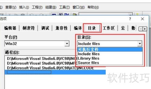 4、 首先选择可执行文件,红线框内显示四条路径,其中黄线框标注的是VC++6.0的安装路径,若不正确,需手动更正为实际安装路径,其余三项同样依次进行核对与修改。