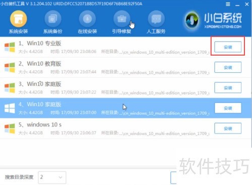 4、 进入PE后,自动弹出一键重装工具,选择U盘中的系统版本即可开始安装。