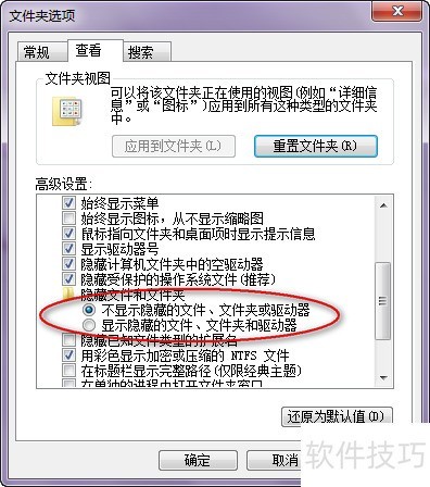 2、 打开任意文件夹,依次点击工具、文件夹选项、查看,勾选显示隐藏的文件、文件夹和驱动器即可。