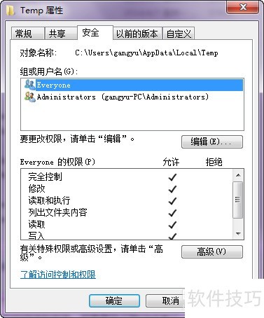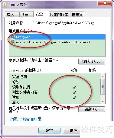 6、 右键点击Temp文件夹,选择属性,进入安全选项卡,查看组或用户名列表中是否存在Everyone账户。