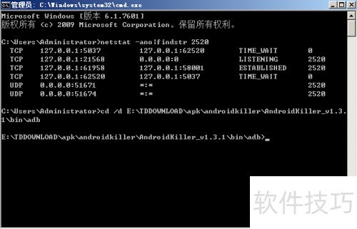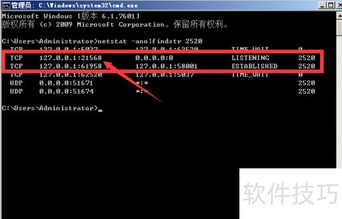 3、 查找夜神模拟器端口号,打开命令提示符输入 netstat -ano | findstr 2520,查找结果中对应端口为彩丽2156。