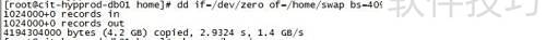 5、 通过dd命令生成一个swap交换文件,具体操作为:读取/dev/zero设备,输出至/home/swap,设置块大小为4096字节,共创建1024000个块,从而生成约4GB的交换文件。