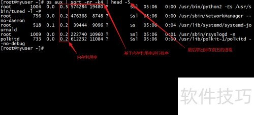 5、 通过执行ps aux | sort -rn -k4 | head -5命令,可列出当前内存占用最高的前五个进程,便于快速定位系统资源消耗较大的运行程序。