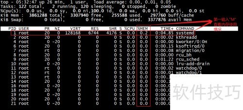 3、 在top命令界面中,首次按下M键,即可按内存占用量对进程进行排序。