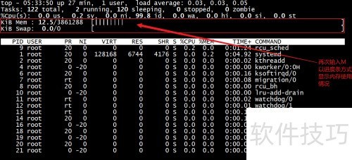 2、 查看特定进程内存使用情况,可使用top命令进行实时监控与分析。