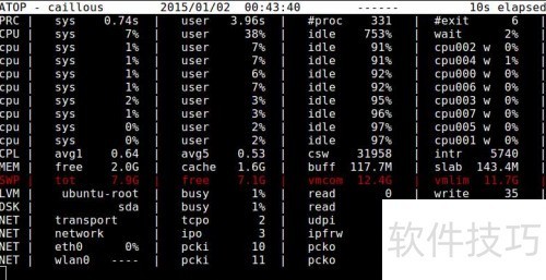 2、 atop是一款运行于终端的系统监控工具,可实时展示CPU、内存、网络、I/O及内核等资源使用情况,并在系统负载过高时以颜色高亮提示,便于快速识别性能瓶颈。