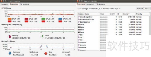 4、 GNOME系统监视器是一款可视化工具,可实时展示近期CPU、内存、交换空间和网络的使用状态,同时提供详细的CPU与内存使用信息的查看功能,帮助用户全面掌握系统资源运行情况。