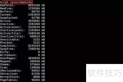 5、 查看内存使用情况最简单的方法是读取/proc/meminfo文件,该虚拟文件内容实时更新,为多种内存监控工具提供基础数据支持。