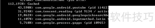 5、 查看特定应用内存使用情况,可使用dumpsyst meminfo加进程名命令,具体操作所示。