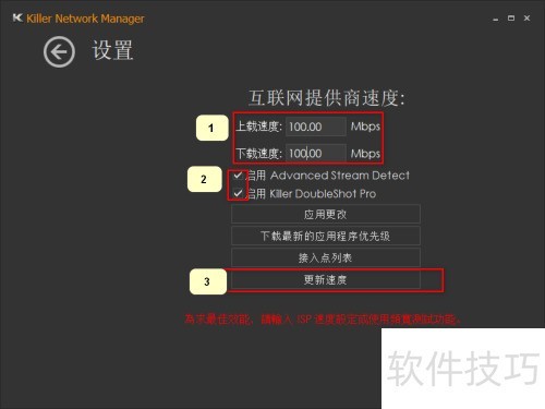 3、 进入设置界面后,根据实际宽带带宽填写下载和上传速度,例如使用100兆宽带则输入100。随后启用Advanced Stream Detect与Killer DoubleShot Pro两项功能,并完成勾选。最后点击更新速度,使设置生效,确保网络性能优化至最佳状态,提升整体使用体验和连接效率。