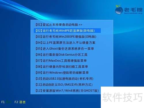 1、 将老毛桃U盘插入电脑USB接口,启动电脑,在开机画面出现时迅速按下启动快捷键,进入老毛桃主菜单界面。使用方向键选择运行老毛桃Win8PE防蓝屏版(新电脑)选项,按下回车键执行,即可进入PE系统界面,准备进行后续操作。