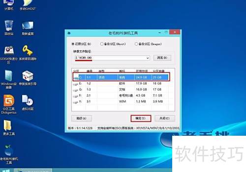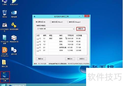 2、 进入PE系统后,双击桌面上的老毛桃PE装机工具图标。在主界面中,点击浏览按钮,所示,选择所需文件或分区。
