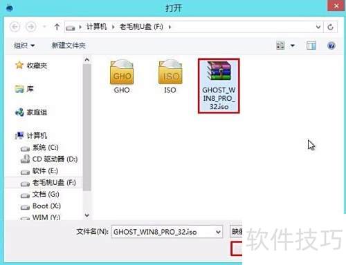 3、 随后将弹出窗口,进入U盘目录,找到并选中Ghost Win8系统镜像文件,点击打开按钮完成操作,所示。