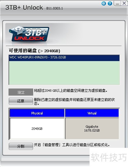 2、 下载技嘉3TB解锁工具,运行后软件将自动检测硬盘。点击建立可将硬盘划分为2TB虚拟磁盘与1.6TB存储空间,随后点击分割,系统将启动磁盘管理工具进行后续操作。