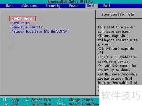 3、 将光标移至CD-ROM Driver,持续按下+键,直到CD-ROM升至首位。